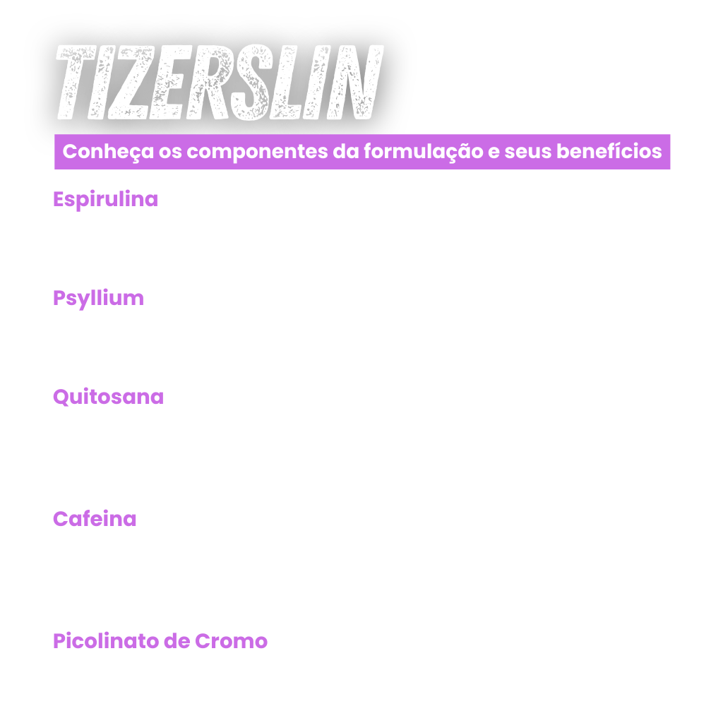 Com ingredientes selecionados como espirulina, psyllium, e quitosana, nossa fórmula inovadora ajuda a reduzir o apetite, melhorar o metabolismo e promover a perda de peso de forma saudável. Experimente Tizerslin e transforme seu estilo de vida!